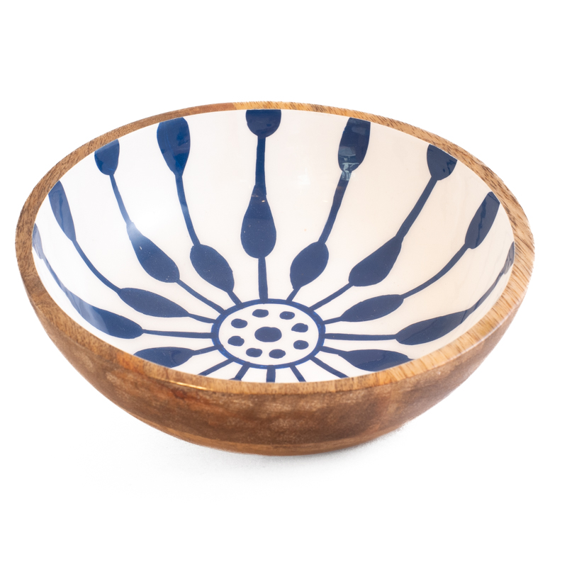 Deze handgemaakte schaal van mangohout is Fairtrade geproduceerd en met de hand beschilderd aan de binnenkant. Het warme hout en het kleurrijke patroon geven elke schaal een unieke uitstraling. Mooi als serveerschaal, decoratie of om kleine spullen in te bewaren.
